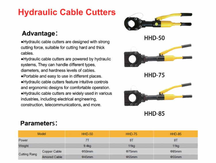 ● Hydrauliske kabelkuttere er designet med sterk skjærekraft, egnet for å kutte harde og tykke kabler.